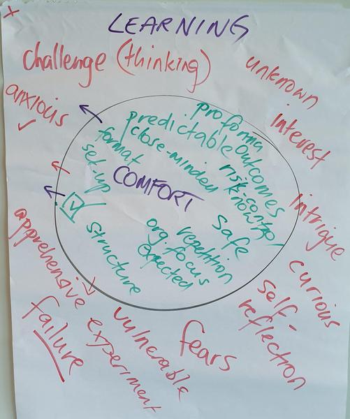Panic (tip: shorten it, fast) Ā Here's a version of the comfort and growth zone I prepared earlier - I miscalculated the space for the panic zone. When you ask what it is like being in your comfort zone, someone usually says 'Comfortable' - just give them that one off the bat. Ā