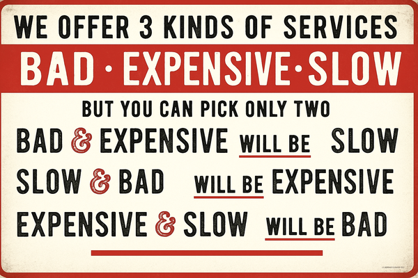 Success Isnât Everything, Everywhere, All at OnceI remember a little sign in an office I worked at. Youâve probably seen it too. It's a classic: âGood. Cheap. Fast. Pick two.â Â